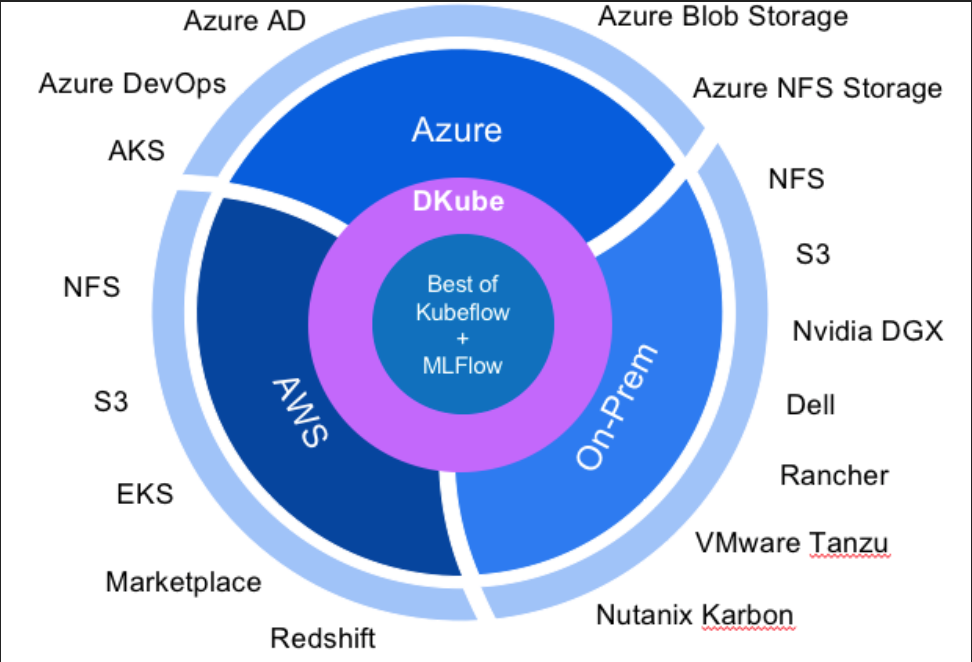 But there is some good news on the Kubeflow movement. New AL/ML platforms that are built from the ground up on top of Kubeflow natively can address this challenge for you. DKube from One Convergence™ Inc., for example has built a standard Kubeflow package with a better and more modern UI and it integrates with AWS EKS, Azure AKS or any cloud or on-prem with Rancher Kubernetes EE, Nutanix Karbon or VMWare Tanzu distribution of K8S. As shown in the graphic below it integrates with Azure Blob or Azure NFS, AWS S3, On-prem S3/NFS/Ceph storage. It integrates with Active Directory or LDAP authentication in any of the cloud or on-prem installations. It integrates with Git, GitOps, Bitbucket, Azure DevOps version control systems. It integrates with healthcare data sources like Arvados or Flywheel. In other words you get a shrink wrapped package that with few simple commands at install and config time can get you going in AWS, Azure, GCP, or on-prem on a Kubernetes distribution of your choice. From install start to users onboarded can be as quick as a few hours, or a day depending on the complexity of the cluster.
