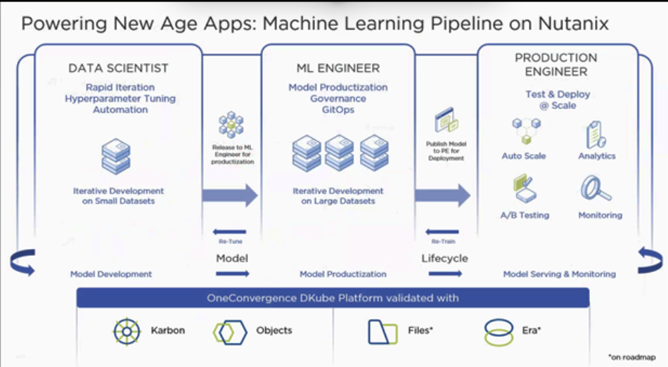 With Nutanix Karbon customers get that supported Kubernetes. Along with Nutanix Objects and Files as the foundation underneath Dkube brings AI/ML model development and deployment wherever Nutanix customers are, wherever their data is - onprem or in the cloud. Between the support infrastructure of Nutanix and One Convergence customers will get a fully supported AI/ML engine. Just like Nutanix's core platform it runs on Nutanix's own appliances as well as third party servers available from Dell, HPE, Cisco, Supermicro, Lenovo and others.